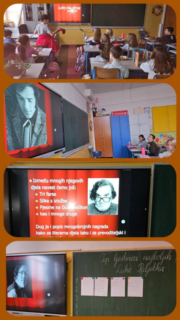 Sljedeći korak bilo je detaljno upoznavanje sa životom i radom književnika Luke Paljetka. Učenici su kroz prezentaciju otkrili brojne zanimljivosti o autoru, a potom s oduševljenjem čitali djelo “Miševi i mačke naglavačke”. Ponavljali su važne književne pojmove poput pjesme, kitice/strofe, stiha, rime i pjesničkih slika te saznali da je Luko Paljetak kao jednu od prvih “igračaka” imao pravog miša u kući koji mu je poslije poslužio kao inspiracija za ovu zbirku pjesama.